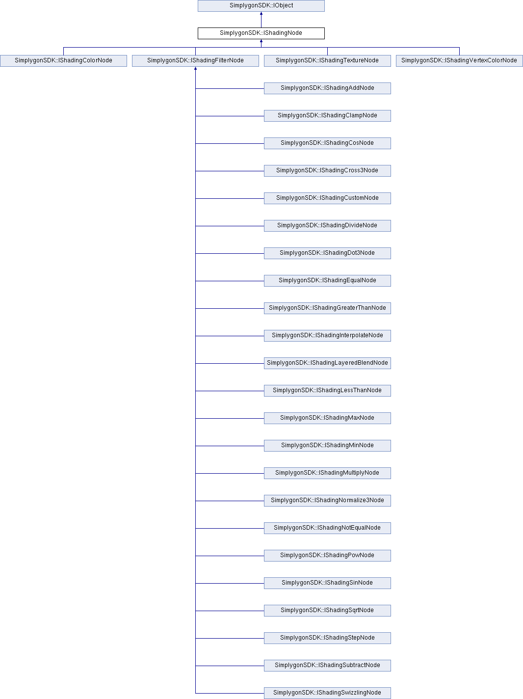 Reimplemented in SimplygonSDK::IShadingLessThanNode, SimplygonSDK::IShadingGreaterThanNode, SimplygonSDK::IShadingSinNode, SimplygonSDK::IShadingCosNode, SimplygonSDK::IShadingCross3Node, SimplygonSDK::IShadingDot3Node, SimplygonSDK::IShadingSqrtNode, SimplygonSDK::IShadingNormalize3Node, SimplygonSDK::IShadingLayeredBlendNode, SimplygonSDK::IShadingCustomNode, SimplygonSDK::IShadingInterpolateNode, SimplygonSDK::IShadingVertexColorNode, SimplygonSDK::IShadingNotEqualNode, SimplygonSDK::IShadingEqualNode, SimplygonSDK::IShadingStepNode, SimplygonSDK::IShadingMinNode, SimplygonSDK::IShadingMaxNode, SimplygonSDK::IShadingClampNode, SimplygonSDK::IShadingDivideNode, SimplygonSDK::IShadingPowNode, SimplygonSDK::IShadingMultiplyNode, SimplygonSDK::IShadingSubtractNode, SimplygonSDK::IShadingAddNode, SimplygonSDK::IShadingColorNode, SimplygonSDK::IShadingSwizzlingNode, SimplygonSDK::IShadingTextureNode, and SimplygonSDK::IShadingFilterNode.
