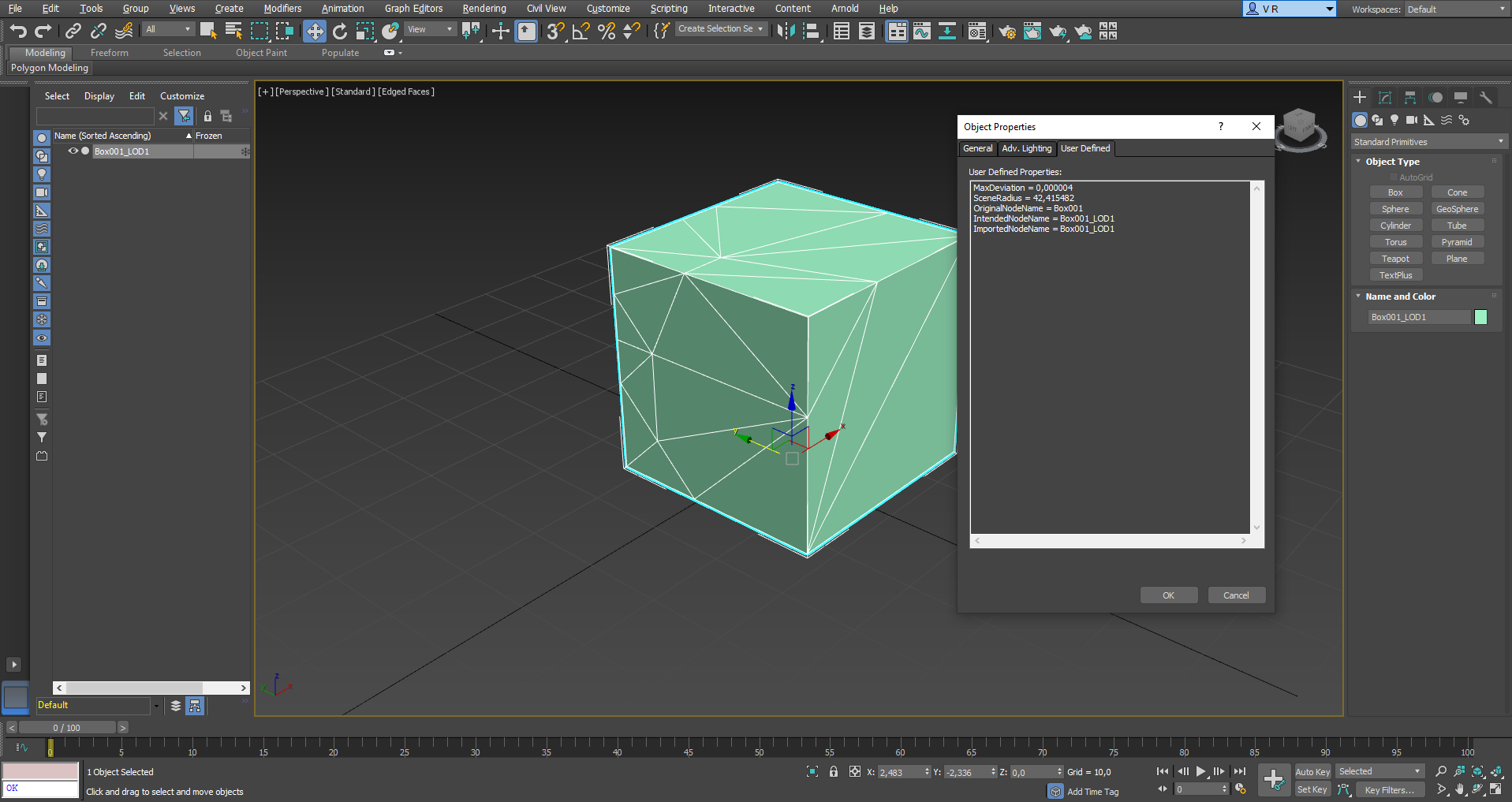 Simplygon writes down custom attributes for each mesh transform that can be used to calculate the recommended LOD-Switch distance. The attributes are MaxDeviation which indicates the pixel deviation compared to the original asset, and SceneRadius which is the total radius of the scene that was sent for processing. All meshes processed at the same time will have the same attribute values, thus also switch distance. MaxDeviation is currently available for Reduction and Remeshing. Aggregation do not have a switch distance as all it does is to merges geometry (and possibly materials), in this example the MaxDeviation gets set to 0 where the attribute does not exists.