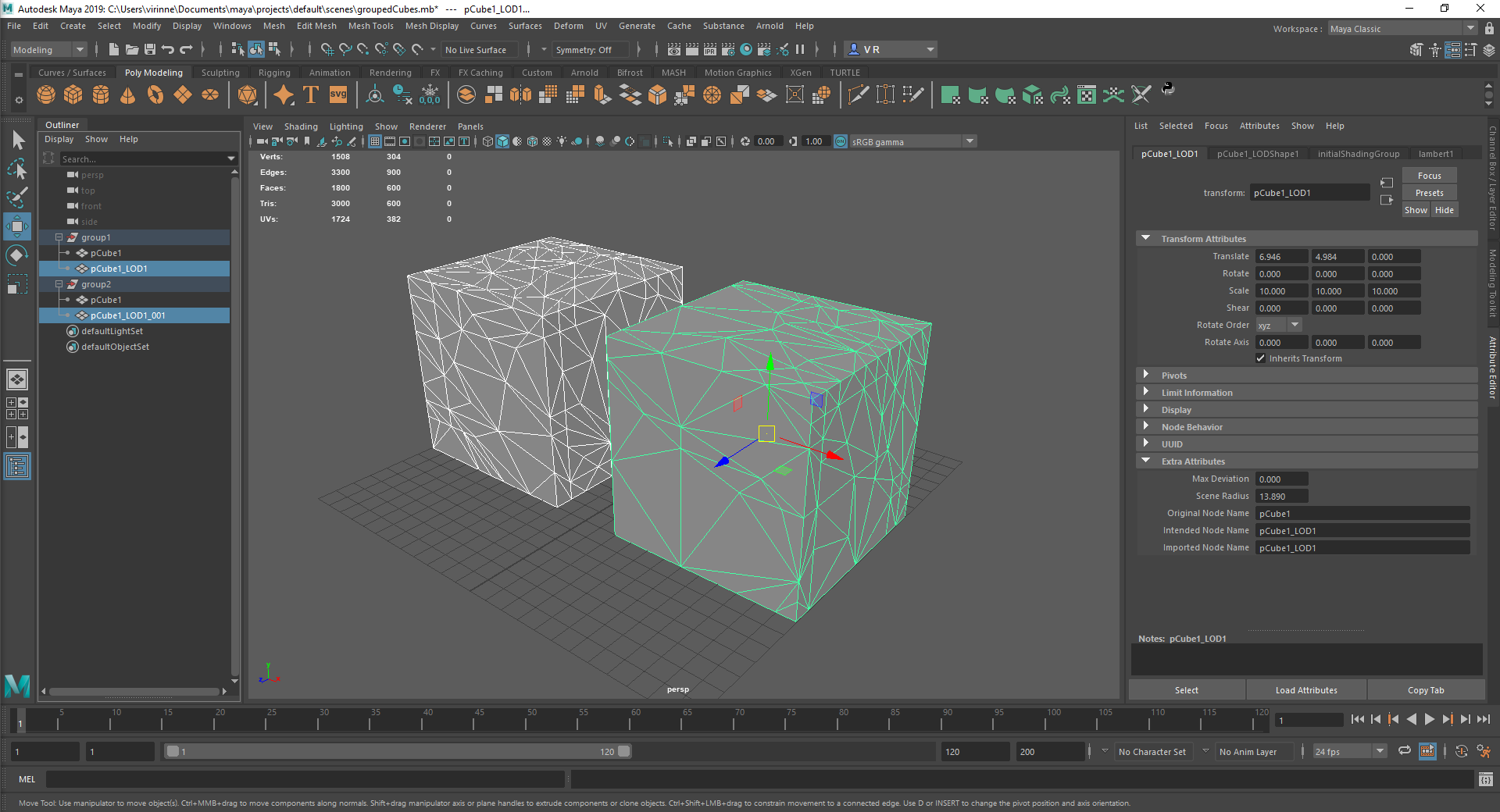If we now were to process this scene (a single reduction) we would get two LOD meshes back, each inserted under the same parent as the original mesh. The first LOD mesh would get the name pCube1_LOD1 which makes sense, and the second one would get the name pCube1_LOD1_001 (as the intended name is already occupied).