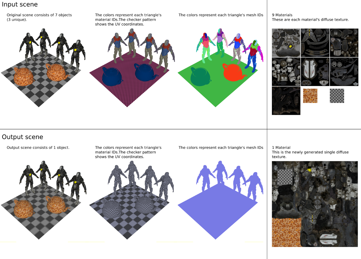The AggregationProcessor reduces the amount of draw calls by taking a scene with multiple objects and materials and converting them to a single object with a single material. It will not produce any geometric changes. The original UV charts are preserved but repacked into a new unified texture atlas. There are some options regarding the UV creation.