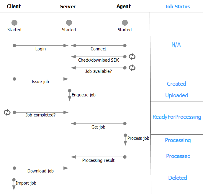 Simplygon Grid execution graph Simplified execution graph depicting job status transition during various stages of component communication.