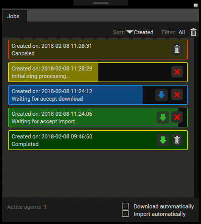 Visualizes the job progress. This view is also responsible for actions such as download and import jobs into the Simplygon UI as well as cancel and delete ongoing jobs.
