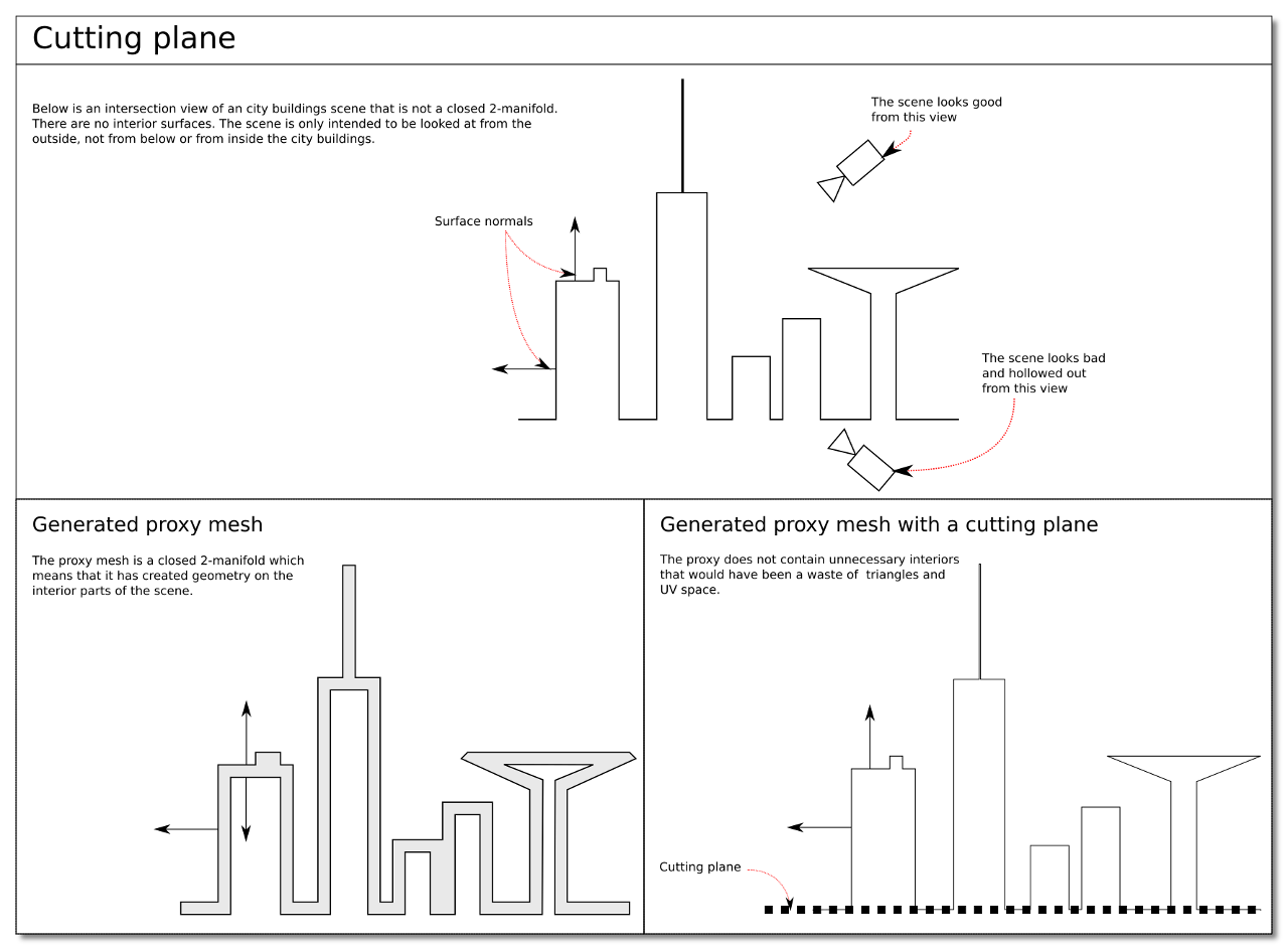 The remesher creates 2-manifolds which means that even 1-sided non-manifold input geometries will become 2-sided - so sometimes the proxy models will have generated geometry on a side that is not intended to be viewed. For example: if a one-sided plane is being remeshed, the generated 2-manifold proxy will get a back side as well. All the geometry on the bottom side in this case is excessive. A cutting plane can be used to remove all parts of the mesh that is behind the cutting plane. By placing the cutting plane on the ground of scene, the model will no longer be a closed 2-manifold because the bottom is removed and only the intended top geometry will be kept. Multiple cutting planes can be used to cut out tiles of the geometry. Cutting plane Cutting planes