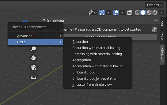 The Blender Simplygon UI is located in the sidebar of the 3D viewport. By default there are no LOD components added, so when you want to run a process you need to add a new LOD component to get started.
